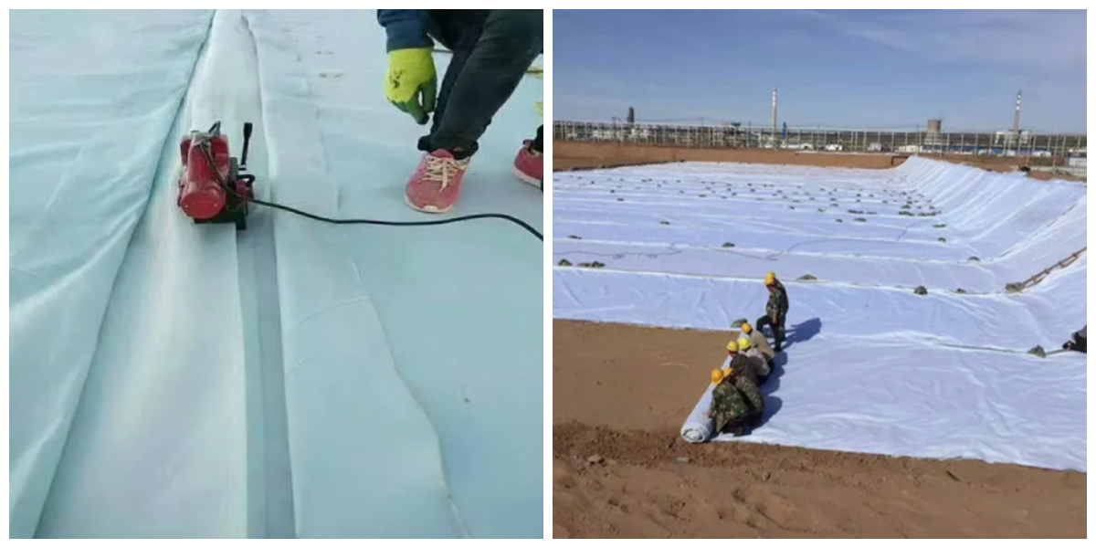 3. Colagem Composta: O geotêxtil não tecido e a geomembrana são unidos por laminação térmica (fusão a quente a 120-150 °C) ou colagem adesiva (adesivo termofusível ecológico). As estruturas comuns incluem "geotêxtil + membrana" (composto por um lado) ou "geotêxtil + membrana + geotêxtil" (composto por dois lados) para maior proteção.